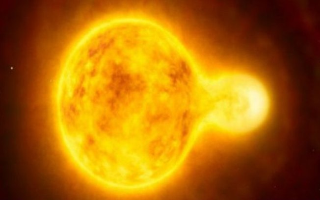 'Sol-satélite' Os pares de binárias seguem uma órbita em torno do mesmo centro de gravidade, mas estão separados por uma distância de mais de 21 bilhões de quilômetros - mais de três vezes maior, por exemplo, que a separando Plutão do Sol. Uma das estrelas duplas é o que a astronomia conhece como "binária de contato" - elas estão próximas o suficiente para se tocarem ou mesmo se fundirem, e compartilham da mesma exosfera (atmosfera externa).