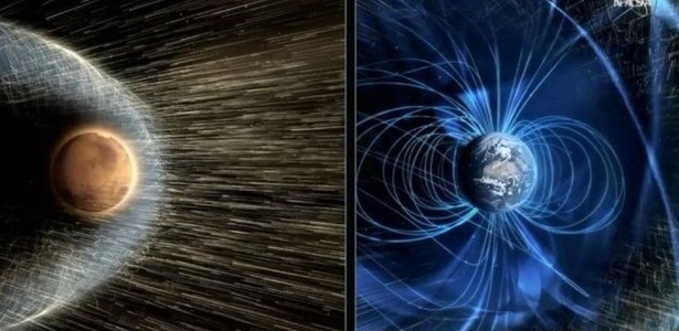 Mas o Planeta Vermelho era muito diferente no passado: dados das missões Maven, da Nasa, e Mars Express, da ESA ( a agência espacial europeia) sugerem que ele tinha um campo magnético natural.