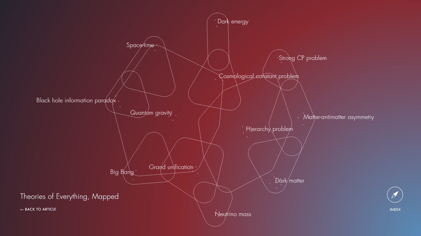 Um novo mapa da fronteira da física fundamental, construído pelo desenvolvedor interativo Emily Fuhrman da Quanta Magazine, faz questionamentos de peso mais ou menos de acordo com a sua importância no avanço do campo. Parecia natural para dar maior peso para a busca de uma teoria da gravidade quântica, que abarcaria a relatividade geral e a mecânica quântica, num quadro único. Em seu trabalho do dia-a-dia, porém, muitos físicos concentram mais no enraizamento da matéria escura, resolvendo o problema da hierarquia do Modelo Padrão, e ponderando os acontecimentos em buracos negros, esses engolidores misteriosos de espaço e tempo. Para cada questão, o mapa apresenta várias soluções propostas. As relações entre estas propostas formam uma rede de idéias.