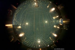 O detector Borexino usa uma esfera cheia de cintilador líquido que emite luz quando energizado. Esse recipiente fica cercado por camadas protetoras e por aproximadamente dois mil tubos fotomultiplicadores para detectar os brilhos de luz.