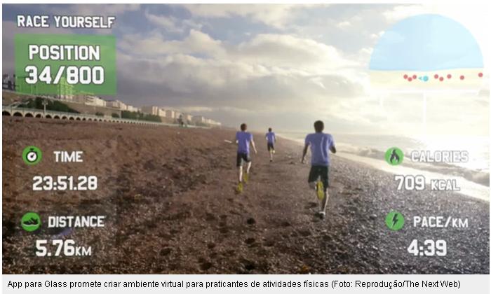 O Google Glass, óculos inteligentes do Google, terá um novo aplicativo que promete animar os amantes de corrida. A novidade fica por conta do Race Yourself, um app fitness que coloca competidores e cenários virtuais na tela do aparelho para incentivar os usuários a gastarem umas calorias a mais.