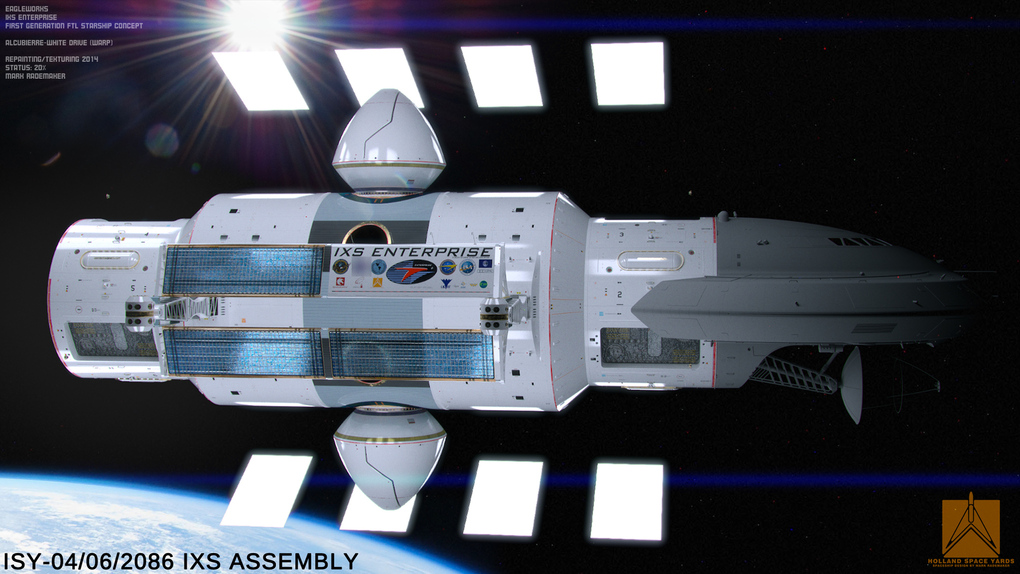 Rademaker trabalhou em conjunto com o Dr. Harold White, da NASA, para produzir conceitos visuais da nave. White e sua equipe estão esperando tornar viagens “mais rápidas do que a luz” possíveis com unidades Alcubierre. As unidades, nomeadas em homenagem ao físico Miguel Alcubierre, teoricamente trabalham com a distorção do espaço-tempo. Ao expandir o espaço atrás de uma nave e contraí-lo na frente da mesma, a IXS Enterprise pode aumentar drasticamente o potencial de viagens espaciais, fazendo uma que, geralmente é de 4,3 anos-luz, para a Alpha Centauri em cerca de duas semanas.