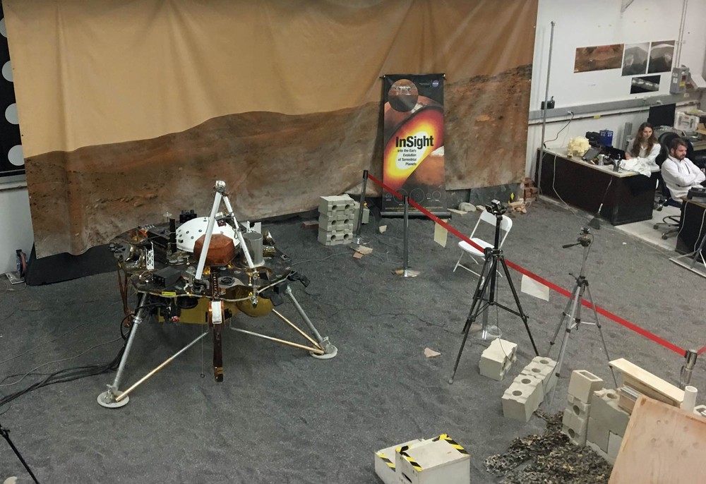 Essa é uma foto do módulo de engenharia da InSight que eu tirei na sala limpa do JPL em Pasadena, Califórnia, durante uma visita em julho deste ano. Esse módulo é uma réplica funcional da sonda que deverá pousar daqui a pouco em Marte, apenas sem seus painéis solares. O propósito de se manter uma réplica como essa é testar algum procedimento que seja necessário fazer em Marte. Se a InSight tiver algum problema, uma solução será testada nesse módulo antes de ser enviada a Marte. Logo depois de pousar, a sonda deverá enviar imagens da região à sua volta para que sua cercania seja replicada no ‘Jardim Marciano’, o campo de testes das sondas com destino a Marte, lá mesmo em Pasadena. O terreno e a disposição das pedras serão usados para planejar a melhor maneira de depositar o sismógrafo no solo.