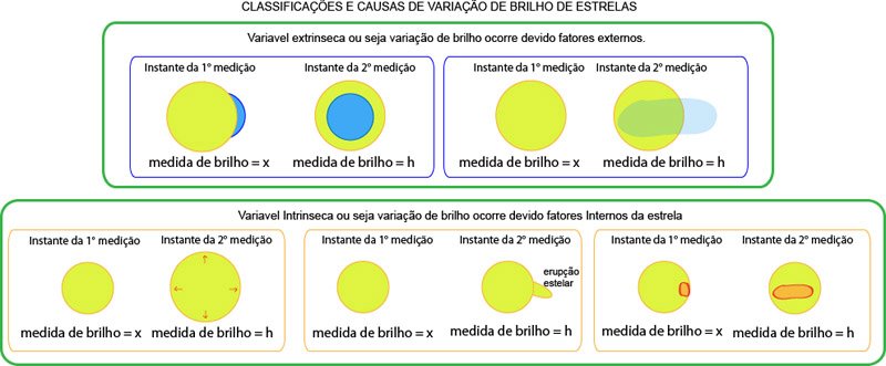 2) Variações decorrentes de fatores externos à constituição física estelar, como eclipses parciais ou totais ocorridos em sistemas estelares binários ou múltiplos de estrelas. Ou seja uma ou algumas me movimento rotacionais em conjunto. Uma estrela com grandes manchas em sua cromosfera pode apresentar-se também como variável, à medida que sua rotação nos mostra faces com maior ou menor intensidade luminosa. Outras ainda podem se tornar variáveis em devido fatores exernos como nuvens na trajetória da luz ate nos. De forma geral, as estrelas que apresentam um destes mecanismos de variabilidade são conhecidas como variáveis extrínsecas.