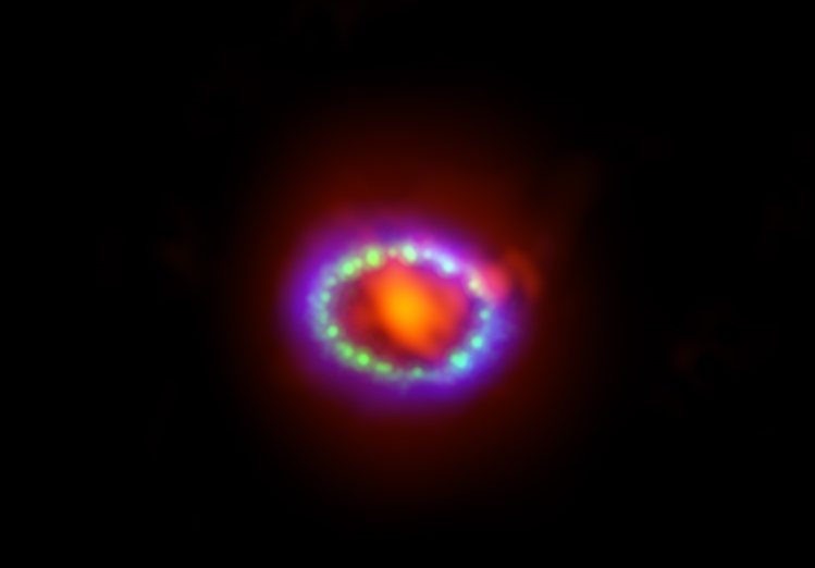 A supermova 1987A vista, em sobreposição, pelos telescópios ALMA (a vermelho), Hubble (a verde) e Chandra (a azul) ALMA.