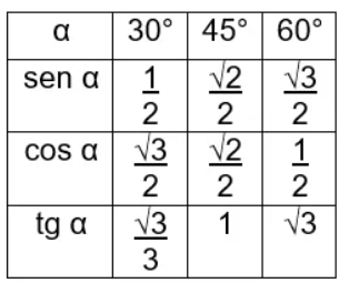 “Existem três valores de ângulos que são amplamente utilizados. Os demais valores podem ser encontrados em tabelas trigonométricas ou nos enunciados dos exercícios, não sendo necessário memorizá-los.”