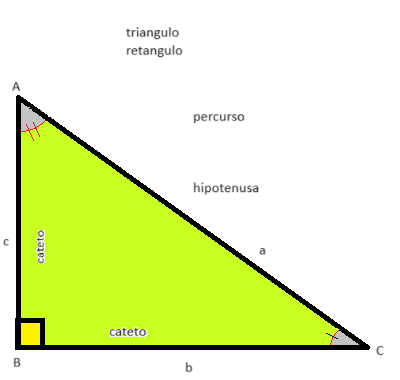 “No triângulo acima, os lados que medem c e b são os catetos, enquanto o lado que mede a é a hipotenusa. O teorema de Pitágoras,