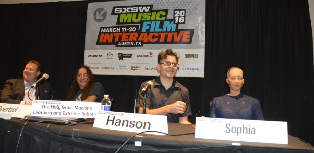 Robô Sophia em sua primeira aparição no festival South by Southwest, Austin, em 2016, ao lado de seu criador, David Hanson